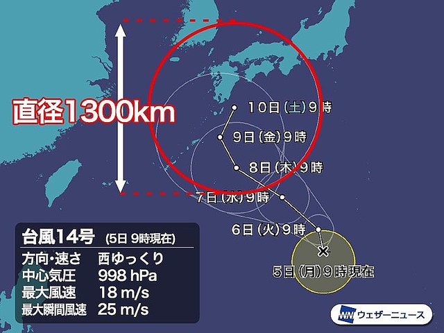 直径1300kmと巨大な予報円の台風14号 進路変化に注意 ライブドアニュース